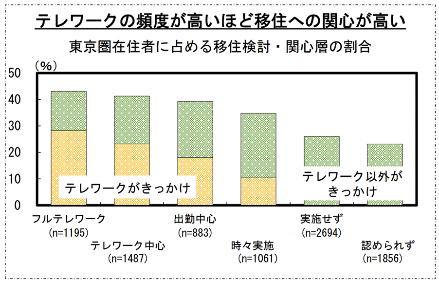 これは実際に国の調査でも裏付けられています。内閣府「新しい働き方と地方移住に関する分析」によると、テレワークを頻繁に行う人ほど「地方移住への関心が高い」という結果が出ています。