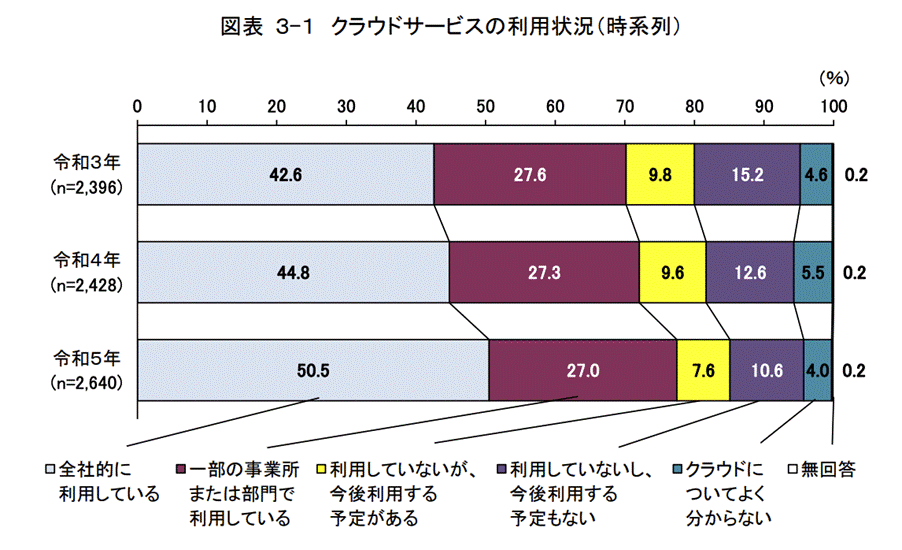 総務省の調査「令和5年通信利用動向調査」によると、企業のテレワーク導入率は約5割で定着し、クラウドサービスを利用している企業は約8割にも達しています。