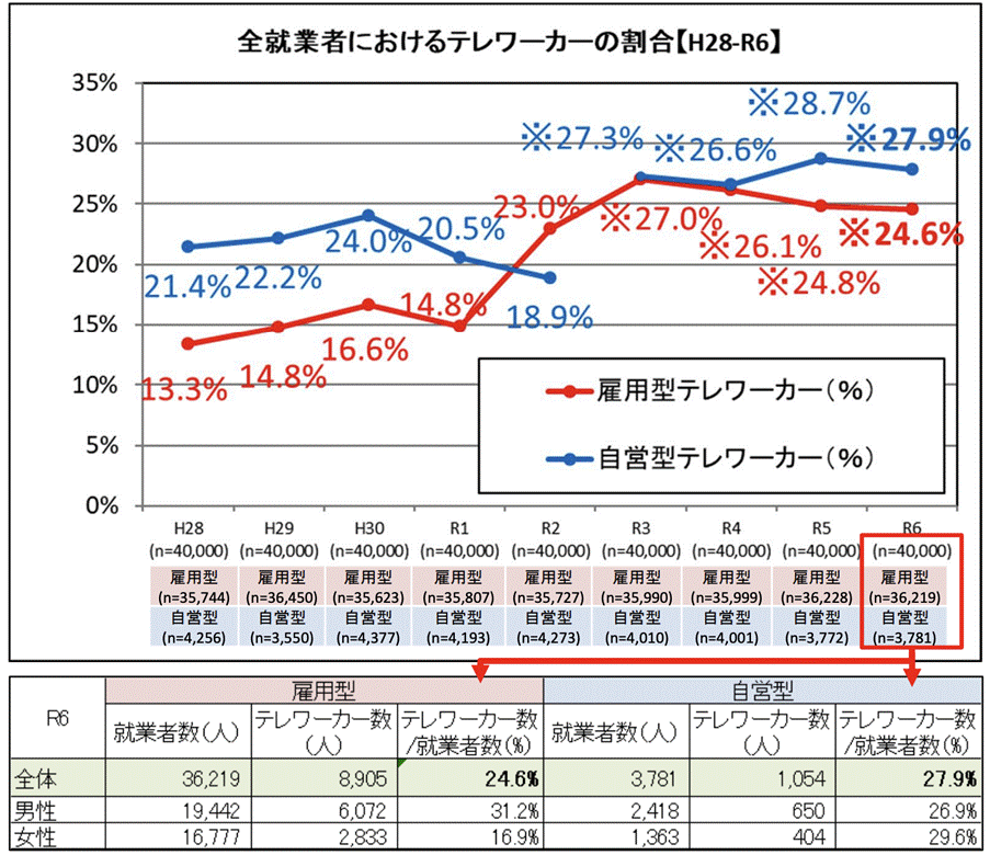 国土交通省の令和6年度 テレワーク人口実態調査によると、雇用型就業者の24.6%がテレワークを実施しています。