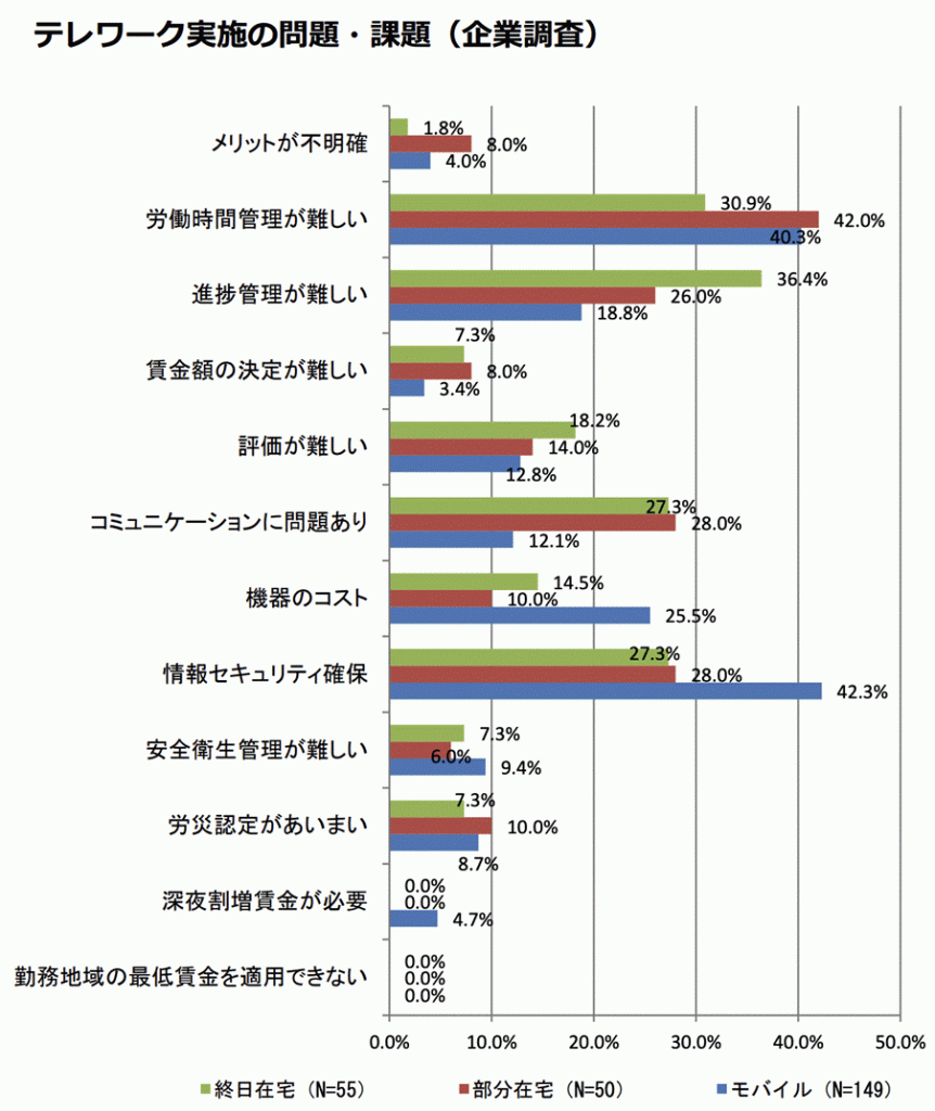 厚生労働省の「雇用型テレワークの現状と課題」でも、テレワーク環境では労働時間管理や進捗管理、評価の難しさが課題として挙げられています。