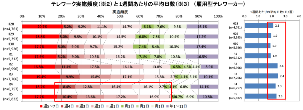 国土交通省のテレワーク人口実態調査によると、雇用型テレワーカーで週1日以上実施する人の割合は7割を超え、平均実施日数は週2、3日という結果が出ています。